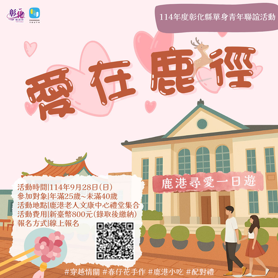 【記者鄭惠珠彰化報導】為鼓勵擴展社交圈,促進青年互動與了解,彰化縣政府將於9月28日(星期日)於鹿港鎮辦理「愛在鹿徑-鹿港尋愛一日遊」單身青年聯誼活動。本次活動開放年滿25歲未滿40歲之單身男女參與,男女各40名,合計共80名,藉由定向闖關、小組換桌交流、春仔花手作體驗與鹿港在地小吃品嚐等多元互動環節,打造輕鬆自然的交友體驗,讓青年能在無壓力的氛圍中認識志同道合的朋友,拓展自身人際網絡,從而建立正向的情感連繫。