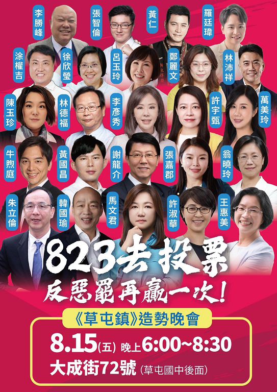 【記者陳良安綜合報導】面對一場「不公不義」、「無差別」的大罷免,國民黨籍立法委員馬文君15日晚間將在草屯鎮大成街72號(草屯國中後面)開講,多名國民黨籍與台灣民眾黨籍立委助講籲反對罷免。馬文君表示,將有全國最強「藍白黃金陣容」集結草屯,旗艦級戰將齊聚草屯,挺公投、反惡罷!