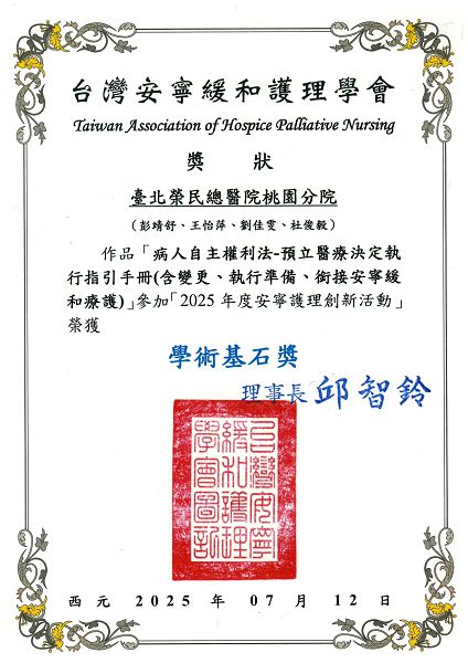 北榮桃園分院榮獲2025年安寧護理創新獎第三名(學術基石獎)。
