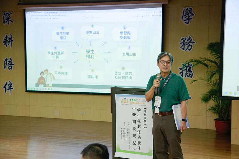 114年度全國大專校院學生事務工作研討會,邀請專家學者專題演講,以及教育部重要業務說明和宣導。八月十四日,國立臺灣師範大學公民教育與活動領導學系副教授林佳範、專責導師室副執行長李立旻,暢談「學生權利保障的變革(含調查調整)」,以及新版的「大專校院友善校園人權環境指標」,並建置線上指標系統平臺,預計9月正式上線。八月十五日,國立雲林科技大學教授陳斐娟主講「社會情緒學習概念與推動」,以及龍華科技大學學務長王延年主講「日本考察心理健康業務推動經驗分享」。