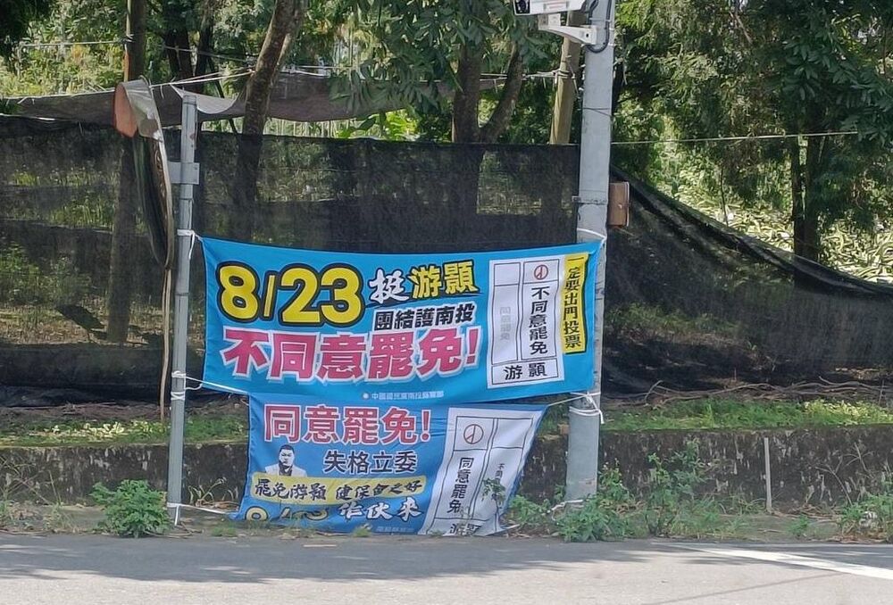 【記者陳良安南投報導】南投縣2選區立委游顥為反罷免、勘災奔走,日前血尿就醫,遭罷團冷血霸凌,近期支持者發現罷團仿游的文宣,以藍底紅字製作布條,企圖混淆視聽,甚至偷天換日,割除游顥的反罷免布條,改掛上魚目混珠的同意罷免布條,游顥團隊籲罷團適可而止;罷團表示,不予置評。