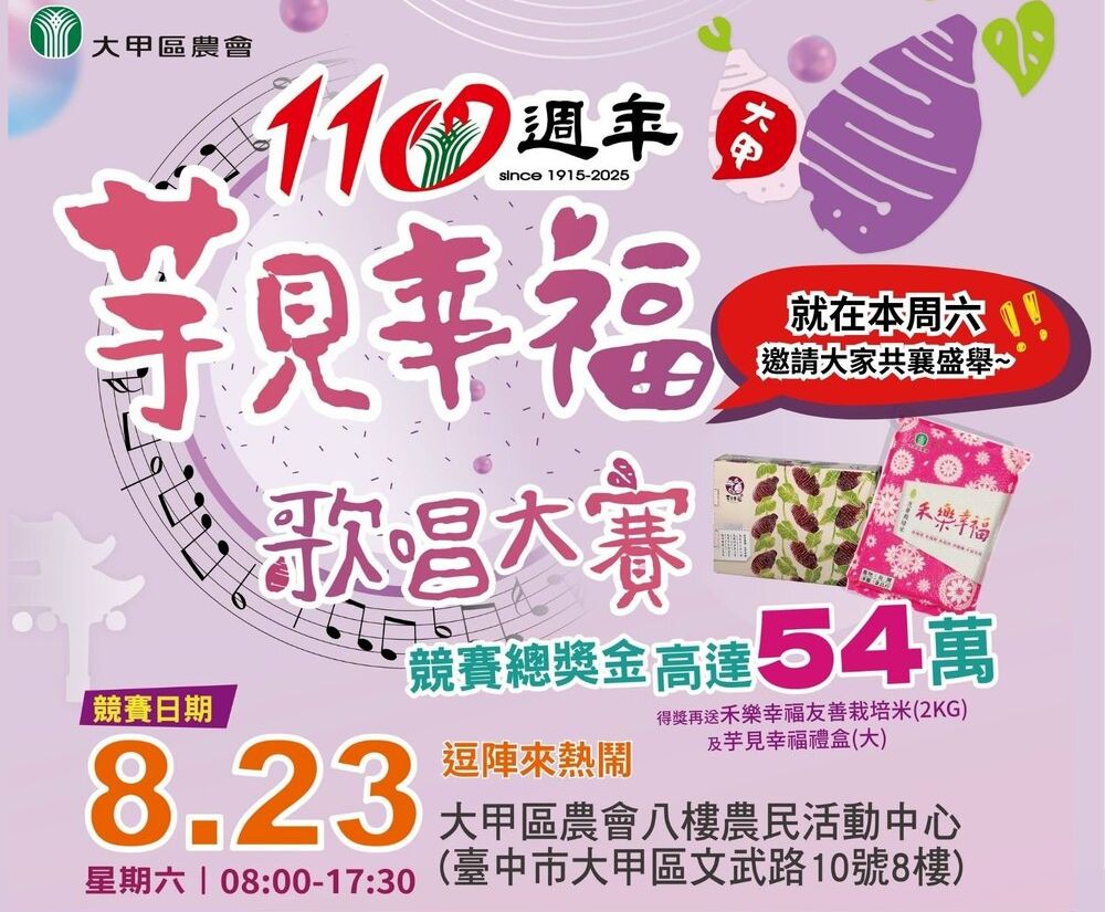【記者陳榮昌大甲報導】大甲區農會今年適逢創會110週年,特別於23日上午9時起,在農會八樓農民活動中心舉辦「芋見幸福歌唱大賽」,邀請全國喜愛歌唱的朋友齊聚大甲,以歌聲慶賀農會成立110週年,傳遞健康、幸福與長壽的美好意象。