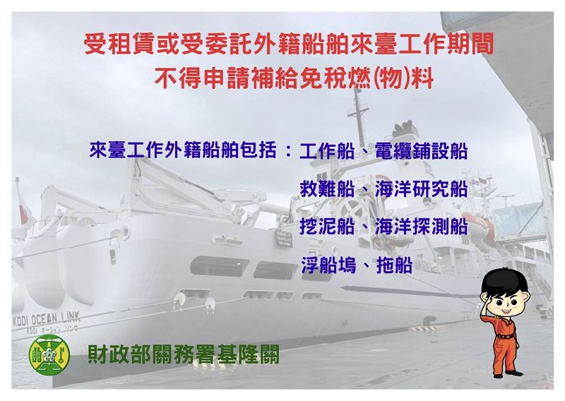 【記者柳芬馨基隆報導】基隆關提醒,外籍工程船補給不適用免稅規定。