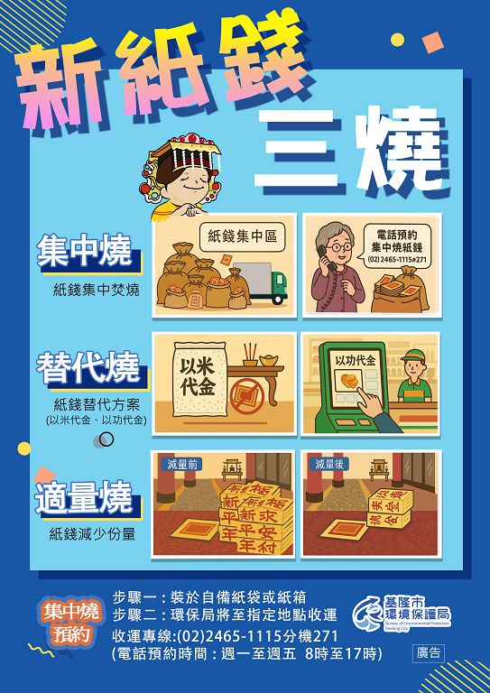為便利市民參與,環保局提供紙錢集中收運服務。民眾可透過電話專線(02-24651115分機271)預約免費紙錢收運,登記時僅需於預定日之前至少提前一個工作天聯繫,服務時間為每週一到週五上午8點到下午5點。收運作業於週一到週六上午9點到下午4點辦理,另外,在中元節高峰期間,增開週日上午9點到下午3點三十分,加強服務量能。
