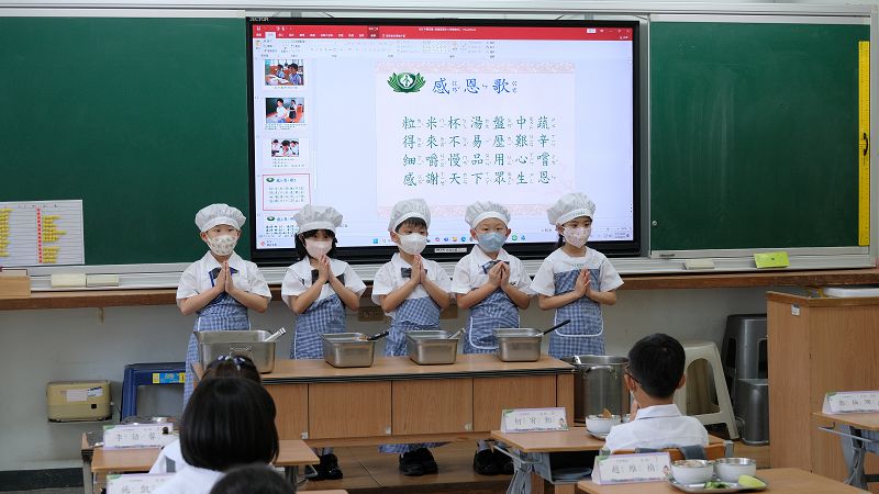學生身穿打餐服,雙手合十齊唱感恩歌,在莊嚴中培養惜福與感恩的心。