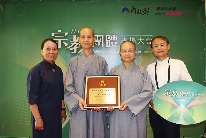 內政部與屏東縣政府首次攜手舉辦「114年宗教團體表揚大會」,8月22日上午在屏東藝術館盛大舉行,內政部長劉世芳及屏東縣長周春米親臨現場,共同見證並表揚183個長年投入社會公益服務的宗教團體,感謝他們無私奉獻及善行義舉。其中,佛教慈濟功德會長期深耕臺灣社會、積極推動慈善公益、環境永續等行動,連續18年榮獲「宗教公益獎」殊榮,由慈濟靜思精舍釋德俱法師與釋德𦔃法師為代表出席領獎,展現宗教力量在社會安定與人心淨化上傳遞正能量。