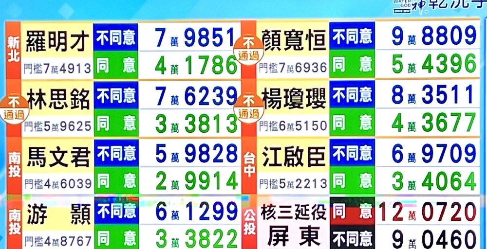 2025年823的投票結果,第二梯次的大罷免七位國民黨的立法委員全部不同意罷免,因此連同第一梯次的24席立法委員,總共31位大罷免的立法委員,都獲得選民的支持而贏得勝利,31比0,大罷免大失敗而有,大罷免大烙賽之譏。