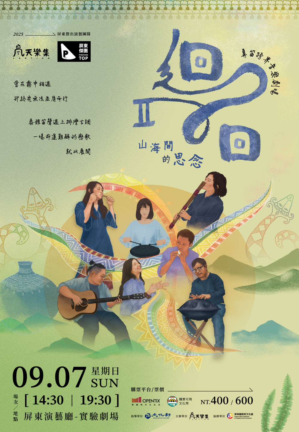 【記者范家豪屏東報導】連續2年獲選「屏東傑出演藝團隊」的嵐天樂集,將於2025年9月7日(日)在屏東演藝廳實驗劇場推出全新製作《迴回II—山海間的思念》,當日14:30與19:30連演兩場。作品延續2024年《迴回》的核心精神,以排灣族鼻笛、口笛為聲音主體,交織族語古調與當代音樂語彙,讓觀眾在山與海之間,聆聽一段以「愛與思念」為名的音樂故事。演出並邀請排灣族鼻笛傳承藝師少妮瑤.久分勒分擔任演奏者,更與排灣族藝術家伊誕.巴瓦瓦隆合作裝置藝術與口笛製作。