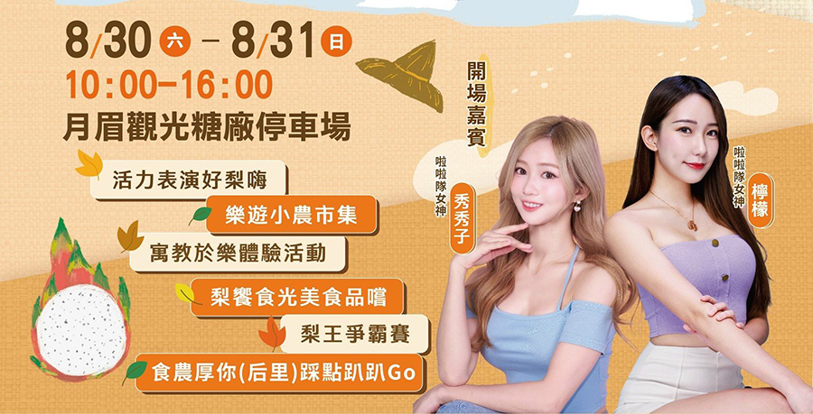 賴區長表示,30日「樂遊后里 好梨嗨」開幕儀式由超人氣「啦啦隊女神」秀秀子與檸檬帶來充滿活力的表演揭開序幕,瞬間可炒熱氣氛。還有許多在地社區表演團體、親子同樂的趣味互動表演及彈唱歌手接力演出,節目豐富精彩可期。