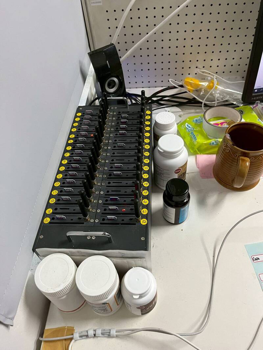 1.南投縣警方查獲9組「貓池」,可同時大量發送詐騙簡訊。(南投縣警局提供)