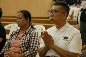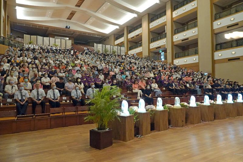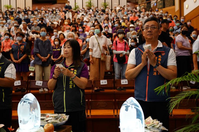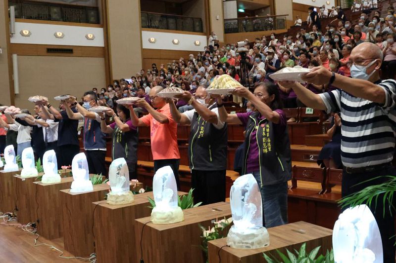 慈濟志工在板橋園區舉辦七月吉祥月邀約板橋區近十位里長及貴賓,帶領里民共同參與莊嚴的供齋儀式。