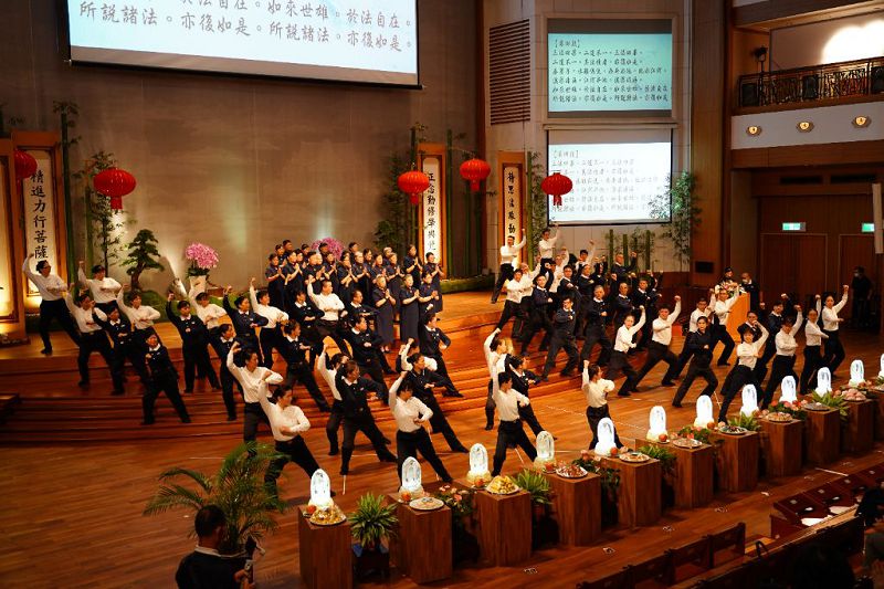「鐘鼓齊鳴、梵唄啟序。」活動由年輕志工以鐘鼓齊鳴與梵唄唱誦《無量義經》揭開序幕,現場莊嚴肅穆。司儀何慈浩表示:「梵唄是佛教的音樂,如同清淨的法水,能洗滌心中煩惱,讓身心安定。」板橋區近十位里長率領里民參與供佛儀式,透過齋戒、不殺生、不燒紙錢,以供齋、供燈、供果表達虔誠之心。民族里里長葉成和分享:「每次供佛都讓我感到祥和與平靜」。