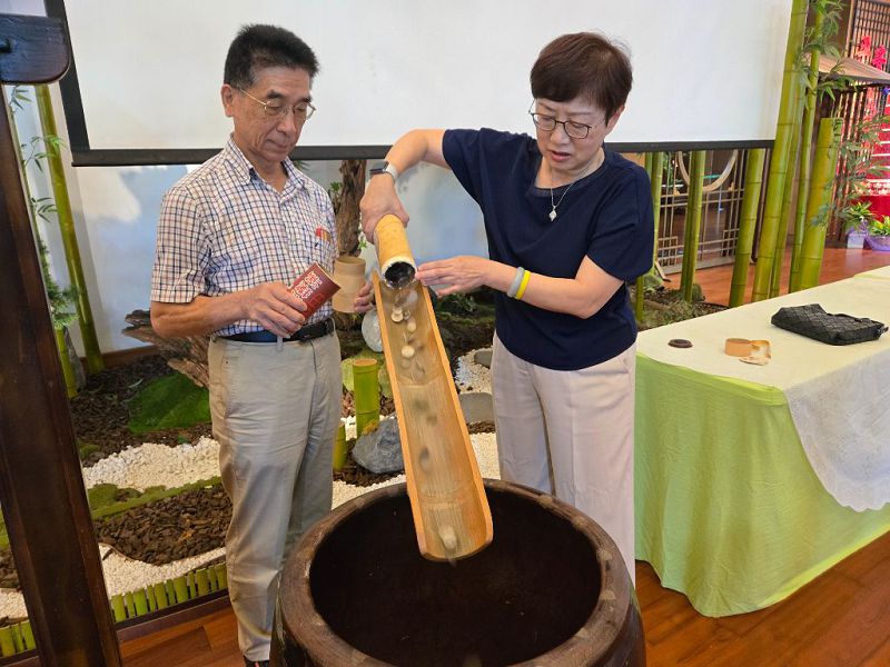 會眾簡芳玲和先生羅進誠更帶著家中小錢筒投入大竹甕,聽著錢幣落下的聲音好感動,立願擴大善行,讓全家一同布施。