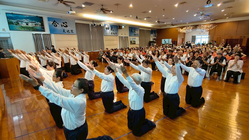 一樓獻供組,有獻燈人員,人人以恭敬心,祈願心燈內外明亮;獻果者,祈願善因皆得善果;獻花者,祈願遍地圓滿吉祥。