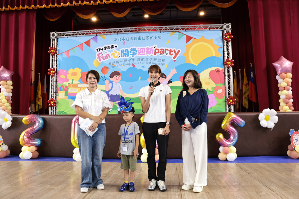 【記者張靜惠基隆報導】迎接114學年度開學日,邱佩琳副市長1日一早趕到東信國小,與教育處副處長楊永芬、工務處簡翊哲處長、警察局長林信雄以及校長曾恕華等人,在校門口迎接小一新生,並為每一位新生戴上校鳥—台灣藍鵲頭冠,恭喜小朋友們展開全新的學習旅程。典禮現場安排森巴鼓、踢踏舞表演,以及體操、高爾夫與跆拳道等特色體驗課程,讓孩子們在充滿活力與歡笑中迎接新學期。