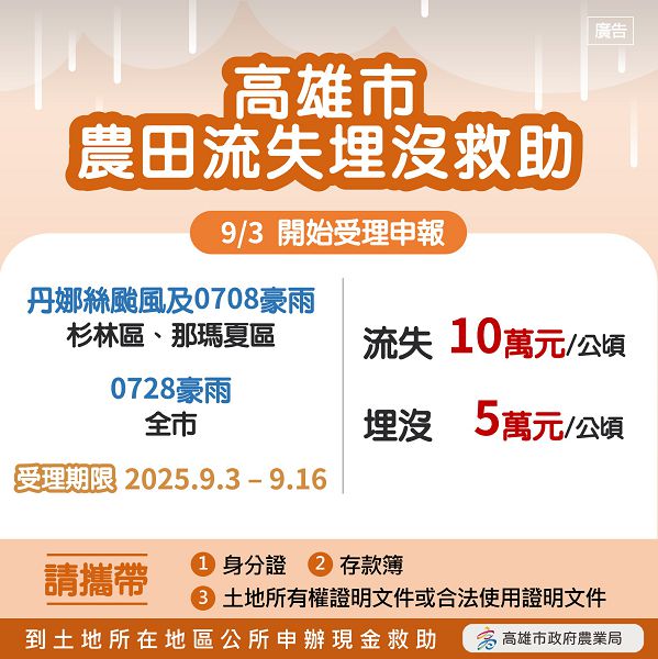 高雄市自7月起分別受到丹娜絲颱風、0708豪雨及0728豪雨影響,除了農產業損失嚴重外,也導致農田土石流失或埋沒,為協助農田受災農戶,市府辦理「丹娜絲颱風及0708豪雨」(杉林區、那瑪夏區)、「0728豪雨」(全市)救助作業,農田流失每公頃救助10萬元,埋沒每公頃救助5萬元,協助受災農民盡早復建復耕,申請期限自9月3日起至9月16日止。農業局長姚志旺提醒,請農田流失、埋沒,受災面積0.05公頃以上農友,於9月16日前持身分證、土地所有權證明文件或合法使用證明文件、存摺影本等相關文件,至土地所在區公所申報。(圖文:記者于欽智)