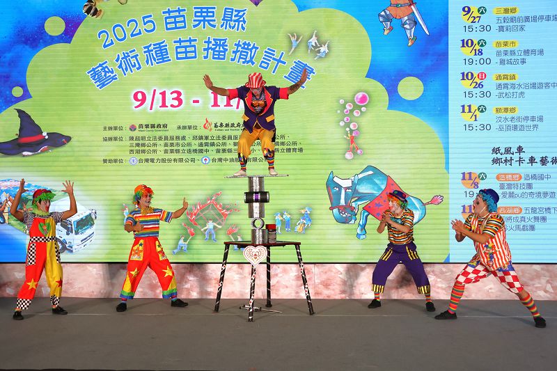 紙風車劇團演出包括:9月13日竹南《唐吉軻德冒險故事》、9月27日三灣《寶莉回家》、10月18日苗栗《雞城故事》、10月26日通霄《武松打虎》、11月1日獅潭《巫頂環遊世界》;台灣特技團11月8日於造橋演出《愛麗pu的奇境夢遊》,即將成真火舞團則於11月29日在西湖呈現《珍火馬戲團》。