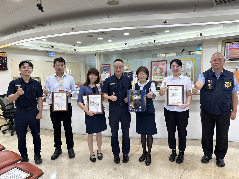 高雄市湖內警分局為提升阻詐能量,積極與轄內金融機構建立密切聯繫管道,每當有民眾疑似遭詐騙臨櫃匯款或疑似詐欺車手前往提領款時,即由各金融機構通報警方到場查證協助並攔阻詐騙,以共同守護民眾財產安全;近日,彰化銀行路竹分行洪姓行員機警察覺鄭姓、黃姓兩位民眾,分別被騙欲匯款至指定帳戶,經與蔡姓襄理、孫姓襄理合作,並通報警察到場處理,才及時保住了被害人血汗錢;湖內分局長蘇茂智特別率領偵查隊長歐承鑫等人,前往銀行頒贈獎狀表揚,感謝他們協助警方攔阻詐騙。(圖文:記者于欽智)