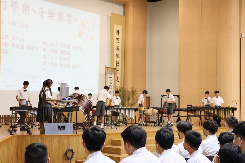 典禮在打擊樂校隊的表演中展開,《海神》以海浪鼓為背景,加入一些特別的音效揭開序奏,鍵盤樂器演奏出象徵號角聲的出航旋律,大鼓從小聲漸強,顯現船慢慢的離開岸邊航向大洋的場景,正好像徵學期開始揚帆啟航的寓意。
