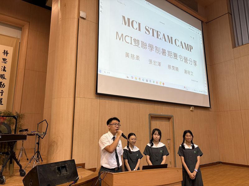隨後,高中部同學透過MCI雙聯學制及美國加州行活動分享,來展現他們分秒不空過的暑期生活,圖書館陳主任也為大家帶來新學期所推動的兩場國際教育的報名訊息,台下的同學們深受吸引。而參加大林慈院志工服務的同學也分享了他們參與志工服務所帶來的成長,期許其他同學能共同參與未來的醫療志工行列。