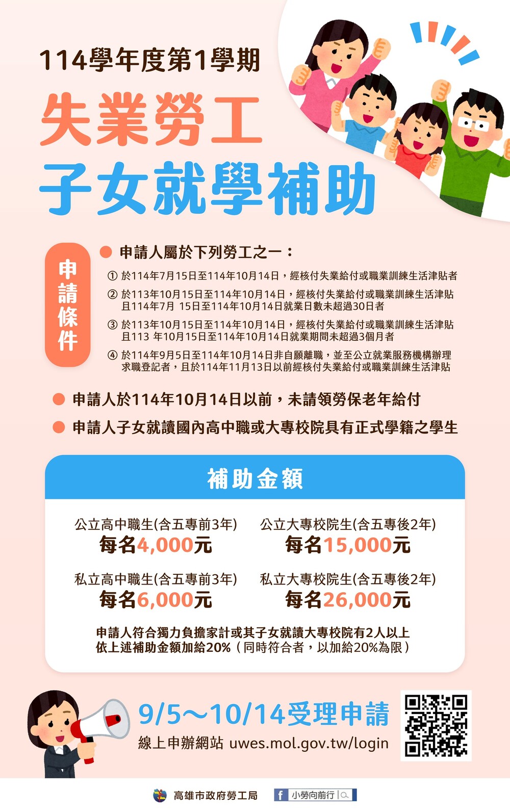 【記者于欽智高雄報導】114學年度第1學期失業勞工子女就學補助自即日起開始受理申請至10月14日止;高雄市勞工局表示,補助簡章及申請表可直接向勞工局1樓服務台、訓練就業中心各就業服務站台或各區公所索取,或自勞工局網站及勞動部網站下載。
