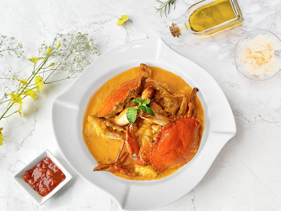 另一道料理即為蟹黃芙蓉燴紅蟳,以嫩滑芙蓉蛋,襯托蟹黃飽滿,以高湯燴製,口感綿密細膩,鮮美中透著高雅,適合喜愛清爽雅致的饕客。