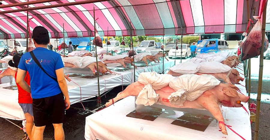 1.名間鄉松柏嶺受天宮中元普度,廟方準備廿一頭大豬公等祭品祭拜好兄弟。