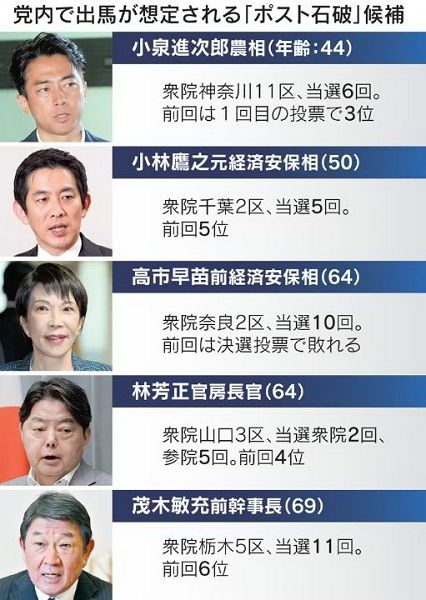 參選總裁需要20名以上自民黨國會議員推薦,除了最受矚目的前經濟安全保障大臣高市早苗、農林水產大臣小泉進次郎、官房長官林芳正,前經濟安保大臣小林鷹之也被點名可能參選,都是去年9月總裁選舉與石破茂競爭的老面孔。其中,自民黨內普遍視小泉與高市為最有利的「後石破」接班人。