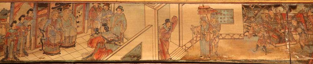 大甲梁宅瑞蓮堂彩繪是目前臺灣建築彩繪史中為數不多且保存較早的對場作品,展現早期工藝創新與環境適應能力。(台灣梁氏比美公脈下宗親會提供)