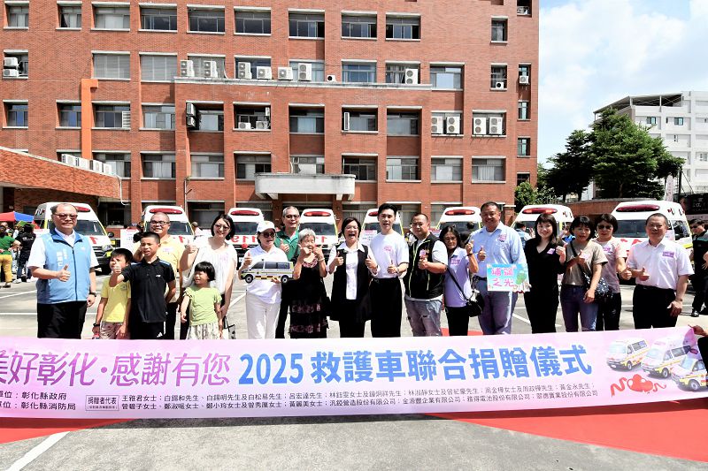 【記者鄭惠珠彰化報導】為感謝各界善舉,彰化縣消防局9日「全國救護日」於警察局中庭舉辦「美好彰化 感謝有您~2025救護車聯合捐贈儀式」,由縣長王惠美代表接受21位捐贈者共同捐贈的13輛全新救護車。
