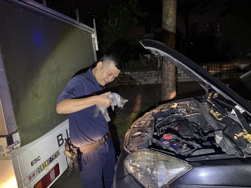 三民二分局陽明所所長詹宗霖與警員王念偉,日前接獲民眾報案,指稱在三民區澄和路上一輛汽車的引擎室內疑似有小貓受困。據報案民眾表示,前一晚便隱約聽見貓叫聲,但以為小貓只是在車底活動,並未多加理會。隔日晚上仍聽到小貓的叫聲,仔細尋找後才驚覺,叫聲竟是從車輛引擎室內傳出,遂立即報案請求協助。警方抵達後,隨即聯繫所內值班人員協助,成功聯絡到車主,並在車主的配合下,員警小心翼翼將受困的小貓順利救出。經確認,是一隻尚未斷奶的小幼貓。見狀,民眾感到又驚又喜,對於小貓能平安獲救感到十分欣慰,並主動表示願意先暫時將幼貓帶回安置照顧,後續將再為小貓尋找合適的新家。(圖文:記者張福全)