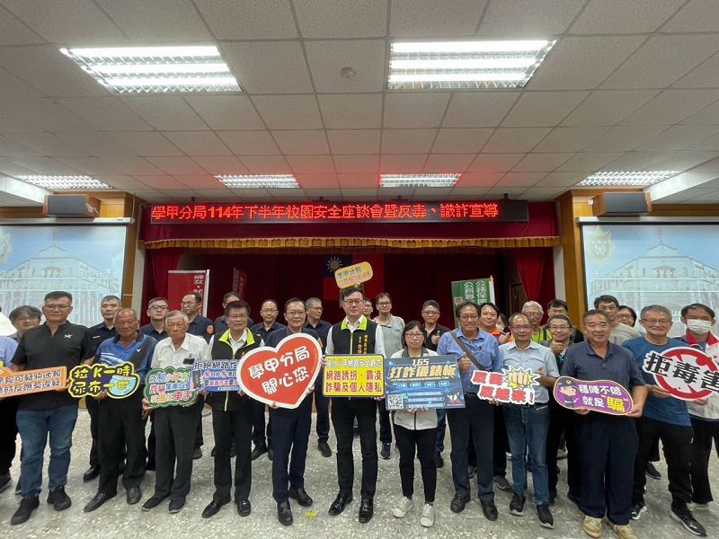 台南市學甲分局為強化校園安全維護工作,確保師生安全與學童安心學習,昨天特別邀集學甲區、將軍區及北門區公所、各級學校代表、里長,以及分局各業務單位、轄內派出所,在分局禮堂召開「114年下半年校園安全座談會暨反毒、識詐宣導」,共同研商校園安全議題。學甲區長張明寶、將軍區長許博森更特別蒞臨指導,展現行政、警政與教育單位齊心協力守護校園安全的決心。(圖文:台南記者黃永豐)