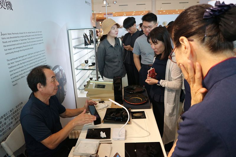 活動中,特別安排漆藝技藝示範,由日本職人現場展示傳統技法-沉金,吸引眾多觀眾駐足觀賞。記者會後,展場舉行藝術家交流座談會,台日創作者齊聚一堂,分享彼此的災後經驗與文化修復的努力。座談中不乏感人故事,如能登漆藝師傅在瓦礫中尋回破碎器皿,重新修補後成為展品;花蓮陶藝家則以震後土壤創作新系列作品,象徵土地與生命的連結。