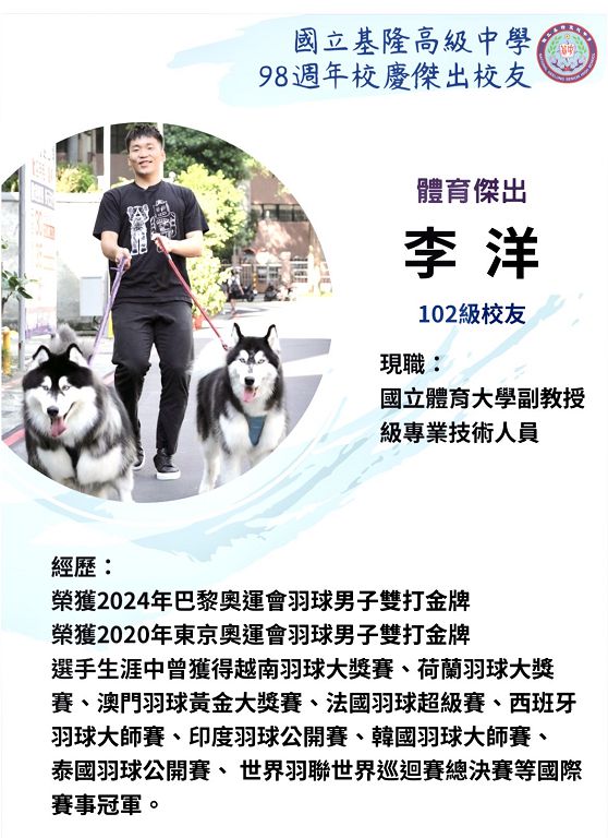 簡稱「基中」的國立基隆高級中學,是訓練國手級羽球名將的搖籃地,有悠久歷史的基中校友會,理事長蔡智潁,副理事長滕起民醫師和理監事等,決定和校方共同推薦李洋為傑出校友,為當部長的第二位校友。