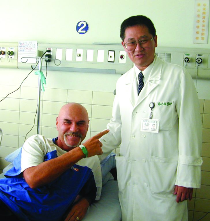 暖心又慈悲的鄭立福醫師(右),三十多年來,搶救無數花東病患,經常想方設法讓遭逢意外的病人避免截肢之苦,重獲新生。圖為一位澳洲籍病人在臺東八仙洞發生嚴重衝浪意外,鮮血直流,輾轉送到兩家醫院,最後轉送到花蓮慈濟醫院急診,正要返家慶生的鄭立福醫師,立刻留下來為他開刀,歷經八小時搶救,不僅挽回一命,也救回他的右腿。