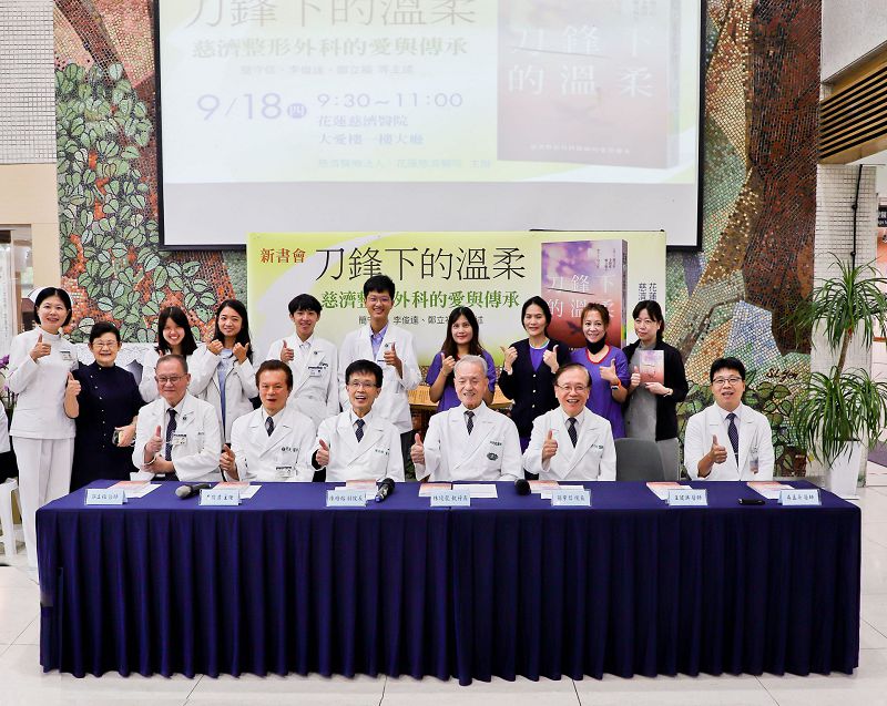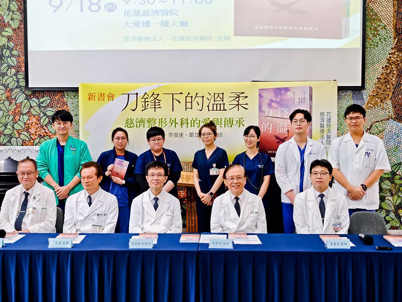 慈濟整形外科醫師、護理師齊聚一堂,寫下並敘說《刀鋒下的溫柔》。前排左起:花蓮慈院鄭立福醫師、李俊達主任、陳培榕副院長、台中慈院簡守信醫師、花蓮慈院吳孟熹醫師。