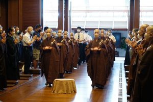 禮佛動線區,慈濟志工為會眾備有「平安香積飯」,意喻把平安的祝福帶回家。並備有茶水區,讓人人隨時補充水分。隨後,慈濟志工還帶領大家手作「五色繩吉祥飾物」,提醒大眾隨身佩戴、時時自勉向善。