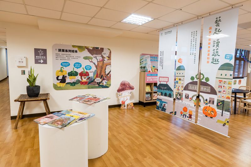 現場展示一系列的蔬果繪本,邀請民眾藉由閱讀認識蔬果,一同徜徉在繪本的世界中。書櫃上陳列多種系列的繪本童書,主題內容豐富多元。