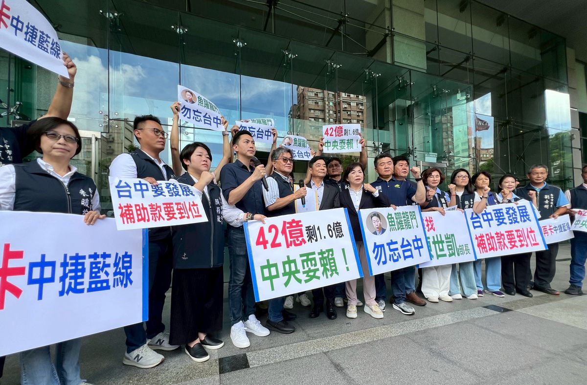 【記者彭勝郎台中報導】台中捷運藍線推動進度延宕多年,行政院2024年1月終於核定綜合規劃,但近日卻傳出,台中市原本向中央提報115年度藍線補助經費42億多元,行政院卻僅核定1.68億元,等於大砍96%補助款,為捍衛市民權益,台中市議會國民黨團22日北上交通部抗議,要求身為台中隊一員的部長陳世凱應積極為台中發聲。台中市議會國民黨團