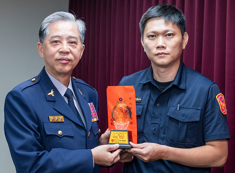 南屯派出所警員吳仁智日前擔服備勤勤務,於七時許接獲報案,稱於文心南三路的好市多大賣場有人意圖持刀自殘,吳員獲報後立即趕往現場處理。警員吳仁智反應機敏,臨危不亂搶救危旦之際,讓警察正義助人形象得以彰顯,經分局督察組長許庭沂及警員李亦偉查證屬實,即時搶救施姓女子性命足為同仁表率、殊值嘉許。局長吳敬田頒發水晶獎座及千元禮券給警員吳仁智。(圖文:台中記者許順德翻攝)
