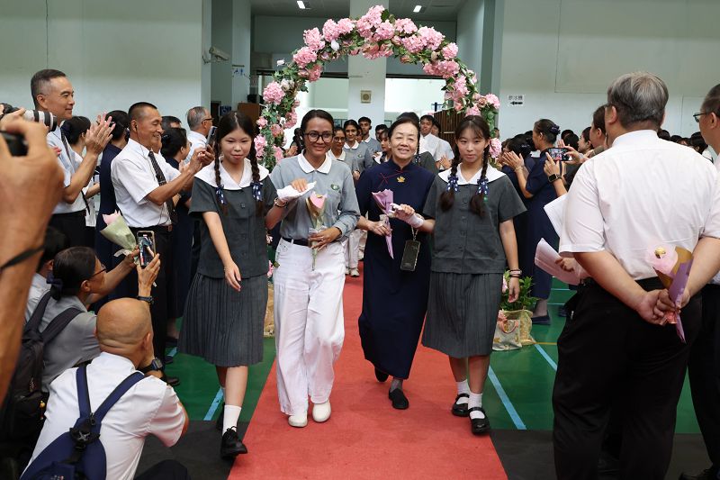 學生慎而重之,踏著一致的步伐,將手中一杯杯無聲的感恩奉給師長