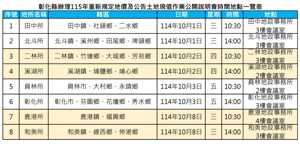 彰化縣115年公告土地現值及公告地價將於115年1月1日公告,為讓各界了解地價調整作業之辦理情形,廣泛蒐集民眾意見,縣府將自114年10月1日起至114年10月8日止,分別於本縣8個地政事務所召開「115年重新規定地價及公告土地現值作業公開說明會」。 地政處表示,說明會除向各界說明地價調查、區段劃分、最近一年地價動態外,同時藉此機會聽取各界人士之意見,經由雙向交流彙整成報告,作為提送本縣地價及標準地價評議委員會評議地價之參考。明年1月1日適逢同時辦理公告土地現值及公告地價兩項作業,其中公告土地現值係作為課徵土地增值稅之依據,而公告地價係作為課徵地價稅之依據,兩者均與民眾權益息息相關,民眾如欲了解所轄地價動態、地價辦理情形等,竭誠歡迎踴躍參加。(圖/文:記者鄭惠珠)