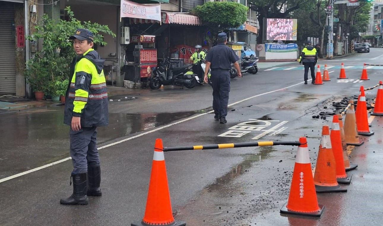 樺加沙颱風來襲,全臺風雨不斷,神岡區中山路口於23日中午12時許突發路面異狀,地面隆起並湧出大量水流,導致原已壅塞的車流雪上加霜。所幸豐原警分局神岡分駐所警員張以恩、譚士瑋獲報後立即趕抵現場,展開交通管制並通報相關單位,有效防止災情進一步擴大。據了解,兩名員警當時正在執行備勤勤務,接獲民眾通報指出,疑似因地下自來水管破裂導致路面損壞並不斷滲水。張、譚二員抵達後立即拉起交通管制線,設置交通錐警示來往車輛,並迅速通報自來水公司派員搶修。搶修過程歷時約一小時,在相關單位與警方協力下,災情順利排除。期間風雨交加,兩名員警仍不畏惡劣天候,持續吹哨、揮手指揮交通,維持現場秩序,獲得眾多用路人肯定,民眾紛紛以點頭或揮手致意表達感謝,展現警民互助的溫暖畫面。所長紀適華提醒,颱風期間行車務必提高警覺,隨時注意前方路況。若發現道路異常或交通受阻情形,可立即撥打110或就近聯繫派出所,警方將第一時間派員協助處理,全力守護民眾行車安全。(圖;記者馬淑娟/文:記者王雲彬)