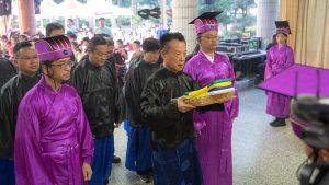 典禮在鐘鼓齊鳴中揭開序幕,由禮生行啟扉、迎神儀式,引導正獻官與分獻官進入大殿,恭敬向孔子及先賢上香獻禮;隨後依序進行初獻、亞獻、終獻三獻禮,並由司祝恭讀祝文,全場肅然敬仰。殿外同時鼓樂悠揚、佾生獻上六佾舞,以莊重舞姿展現對至聖先師的崇高敬意。