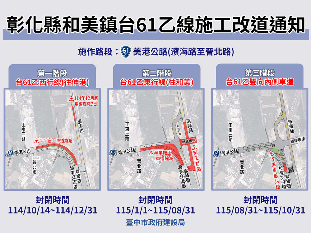 陳局長說明,目前工程進度達78%,即將進入橋梁引道施工,為利工程推進順利,市府啟動彰化端橋梁引道三階段交通管制措施,第一階段自10月14日至12月31日封閉台61乙西行線,第二階段自115年1月1日至8月31日封閉台61乙東行線,第三階段自115年8月31日至10月31日封閉台61乙雙向內側車道,並提供圖卡,提醒用路人注意改道資訊,並依現場指示行駛,以維持通行安全與順暢。