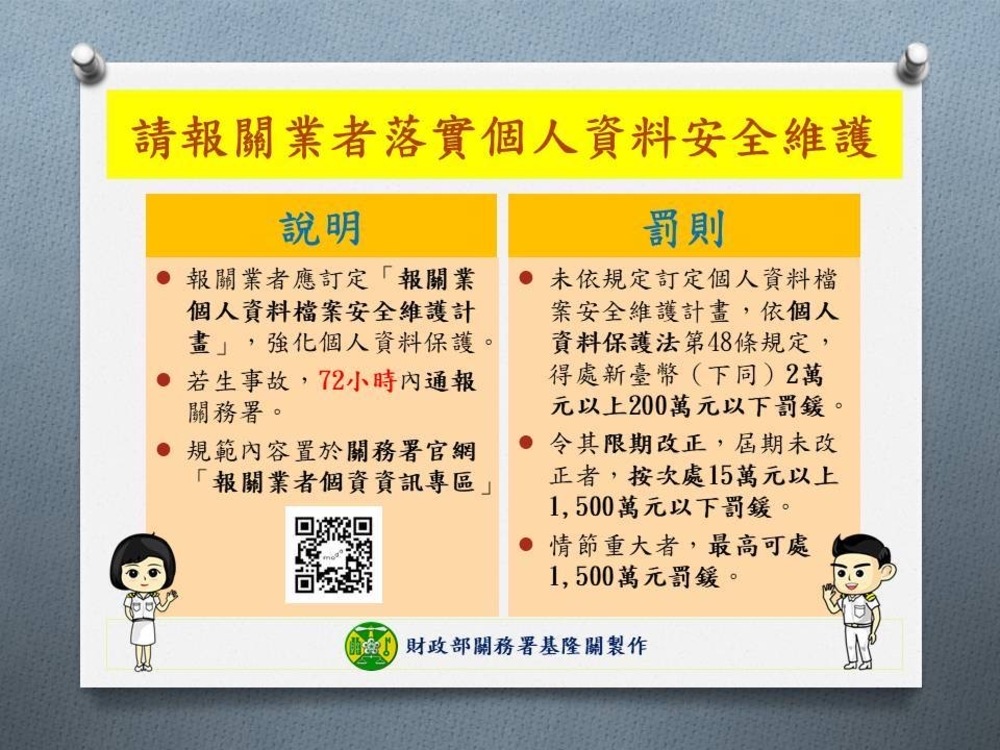 基隆關指出,報關業者應依《報關業個人資料檔案安全維護管理辦法》檢視並清查所持有的個資,建立檔案並制定「個人資料檔案安全維護計畫」,置於營業場所備查,以確保資料安全。