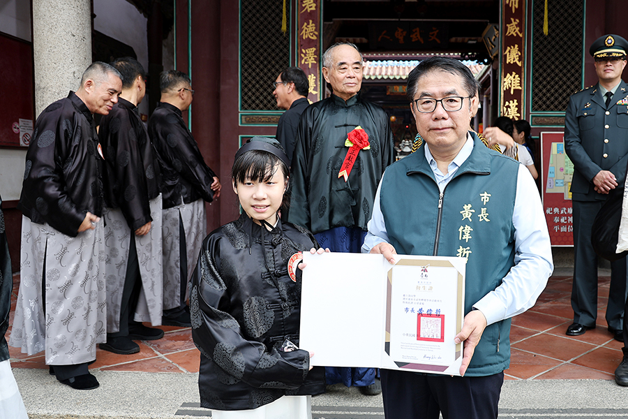 祭奠禮樂生由台南文廟以成書院院生擔任,六佾舞則由永福國小41位學童演出,佾生在學校老師及廟方引領下,行迎神禮表達對武聖的敬意。典禮結束後,市長黃偉哲特別頒發佾生證予學童並合影,讓參與的小朋友留下快樂回憶。