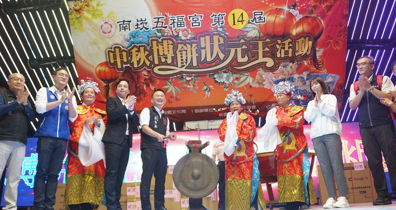 南崁五福宮主委邱進賢則表示,他代表該宮委員會歡迎大家共襄盛舉參加一年一度「第十四屆中秋博餅狀元王」活動,14年來,至去年已辦了1千1百多桌博餅桌次,今年也有120桌,這源自於鄭成功駐守臺灣時期,為解官兵中秋節思鄉之苦,特別設想的活動,代代相傳至今,前桃園市長鄭文燦於任內將之定為「桃園閩南文化節」活動項目之一。五福宮也將持續此深具意義的閩南文化活動。