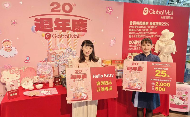 【記者吳峙嵩高雄報導】迎戰下半年各大百貨賣場週年慶商機,Global Mall新左營車站《20週年慶》首波檔期,9日起至22日展開,力推三大採購攻略,包含指定品牌獨家優惠、會員限定Hello Kitty聯名禮,以及消費滿額最高享25%超值回饋,更聯手10大品牌推同慶活動,優惠6折起,搶好康更待何時?