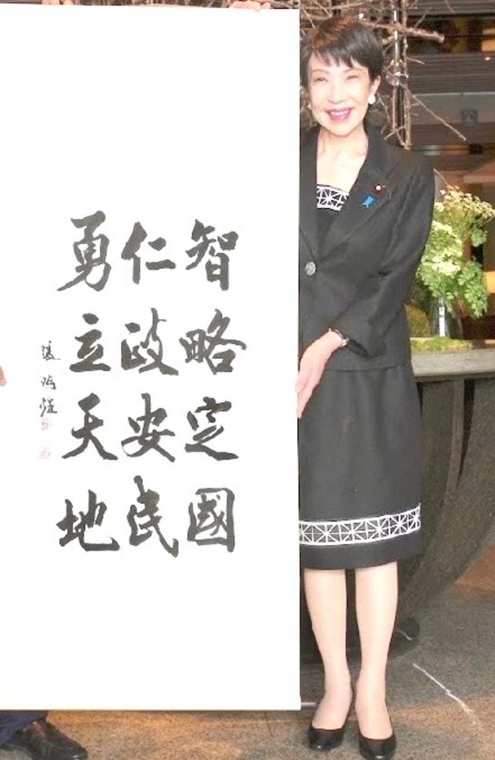 由於高市早苗當選自民黨黨魁,也將是日本第一位女首相,今年四月她來台訪問,很高興獲得受日本外務省大臣公開赠獎表彰有功於文化交流的張炳煌教授的墨寶「智略定國、仁政安民、勇立天地」,好像當時張炳煌已經預測高市早苗會當選日本「首相」。